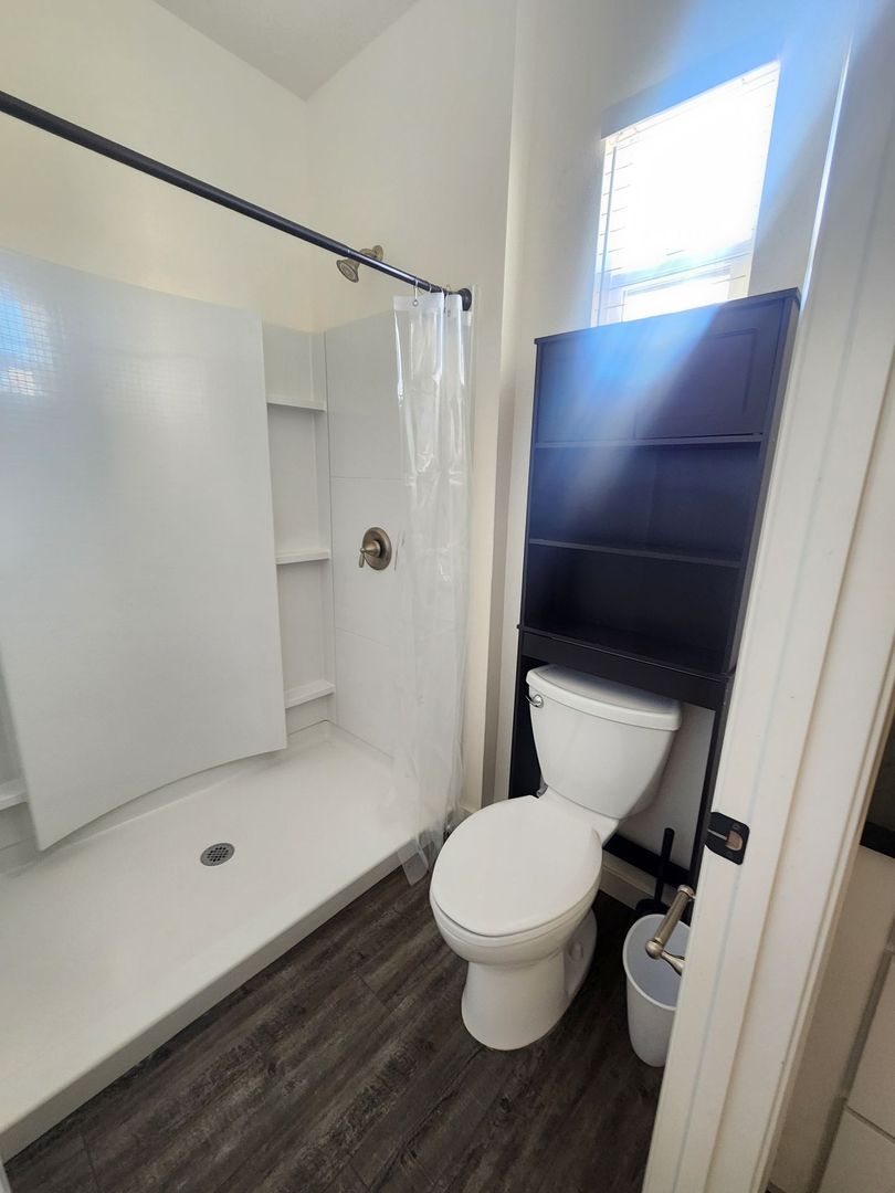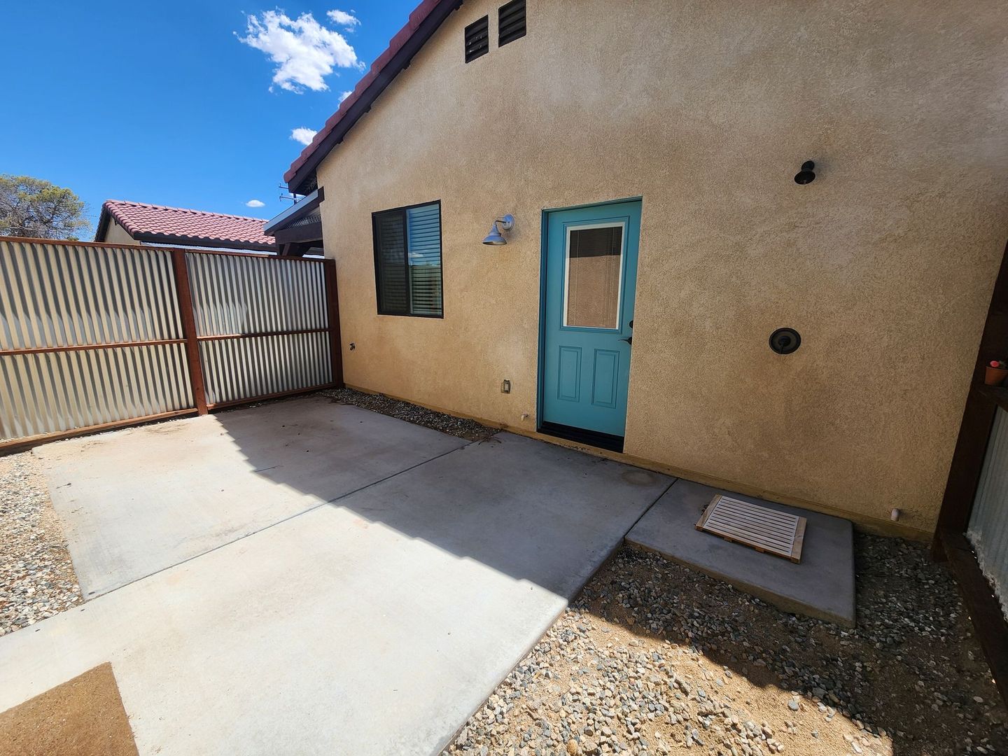 -private, fenced courtyard with an outdoor shower