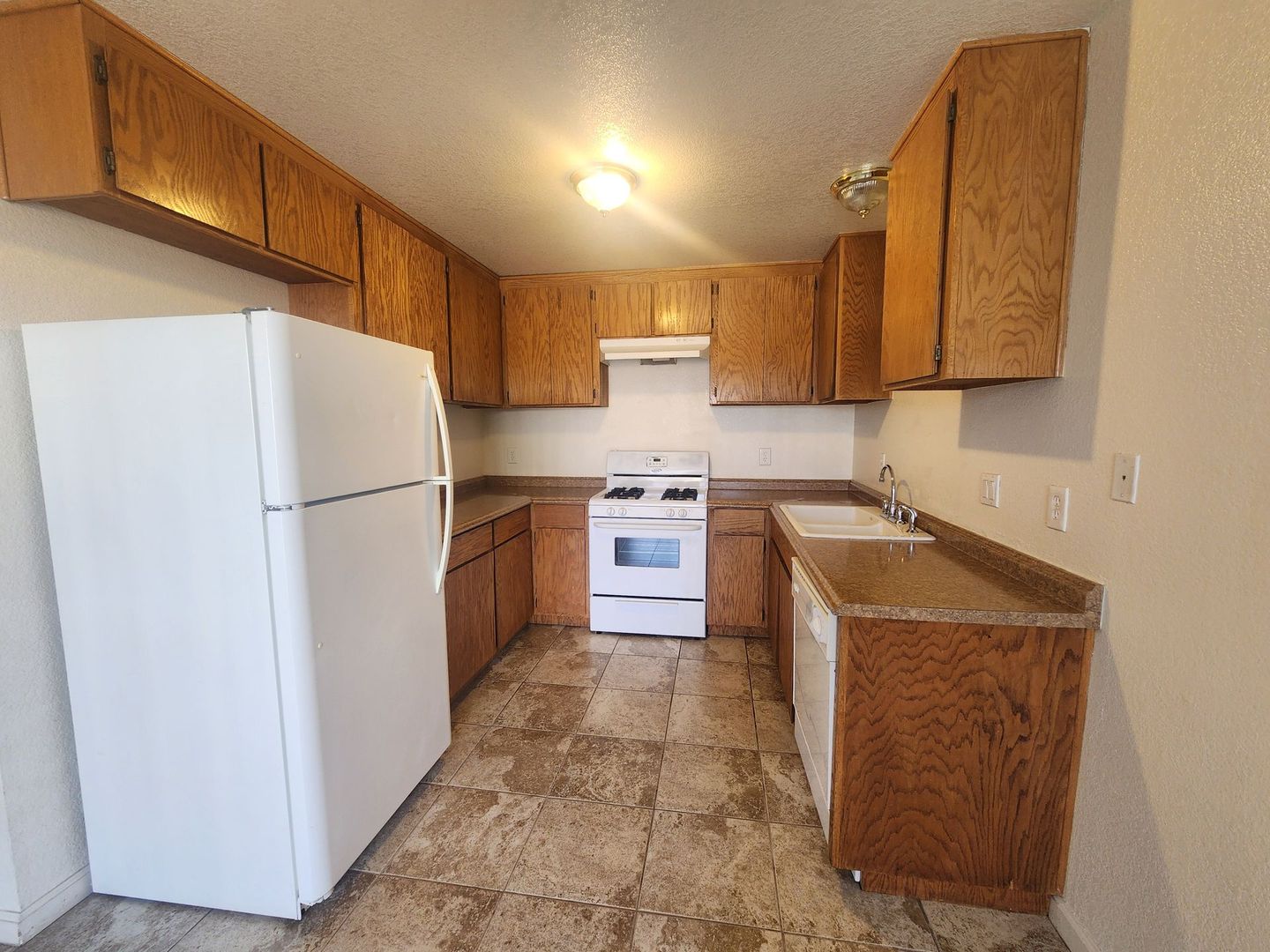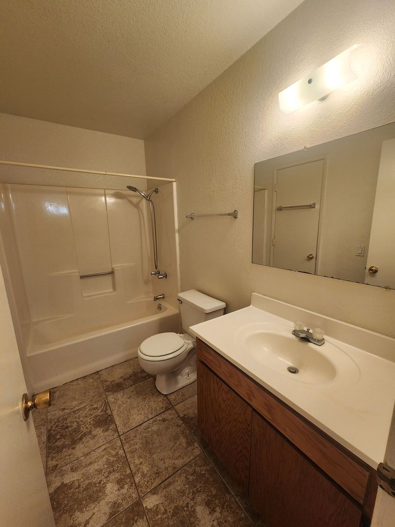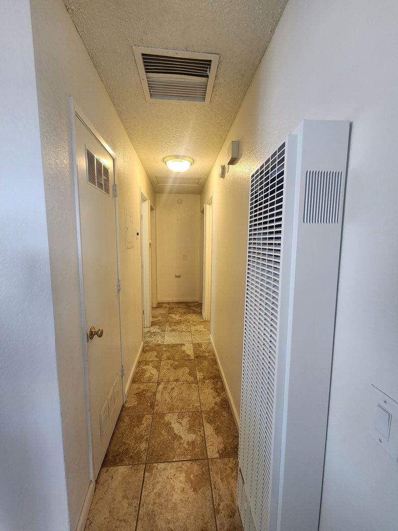 2 bedroom 1.5 bath apartment. Owner pays for water and trash, and free shared laundry room. Apartment has updated tile in living room, kitchen, dining and both bathrooms and carpet in bedrooms. Kitchen has fridge, stove and dishwasher and dining right off the kitchen. Dining room has a sliding glass door that leads to a large, private fully fenced in backyard with a beautiful stained cement patio area. Parking is in the parking lot and has beautiful landscaping which the owner pays for. NO PETS PLEASE
